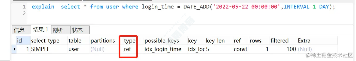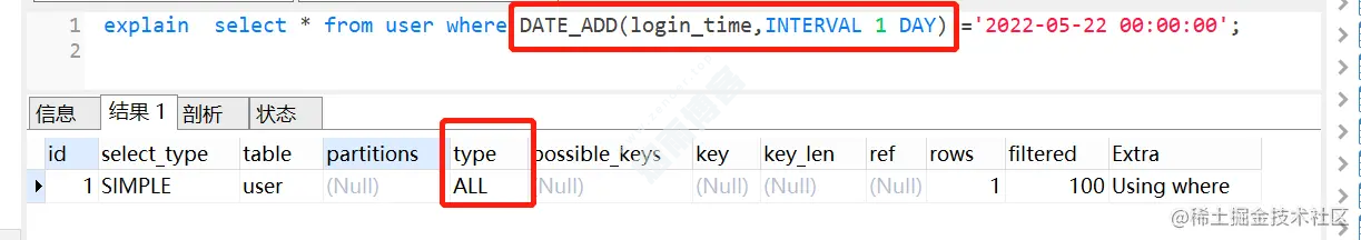 虽然login_time加了索引,但是因为使用了mysql的内置函数Date_ADD(),索引直接GG,如图: