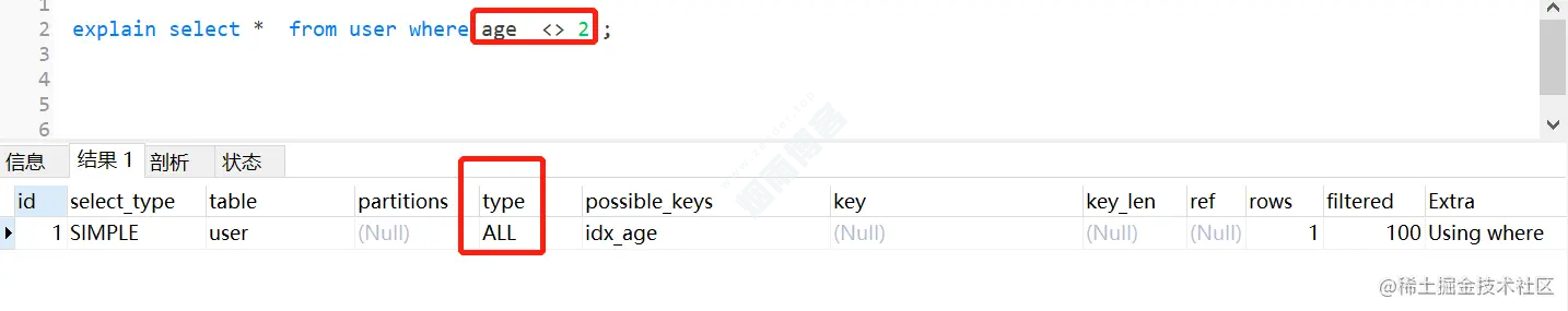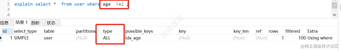 虽然age加了索引,但是使用了!= 或者< >,not in这些时,索引如同虚设。如下: