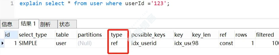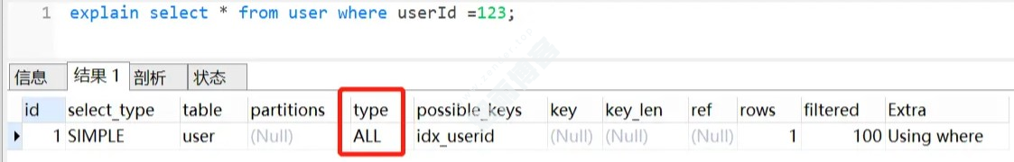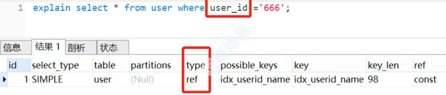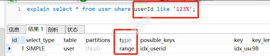 userId 字段为字串类型,是B+树的普通索引,如果查询条件传了一个数字过去,会导致索引失效。如下: