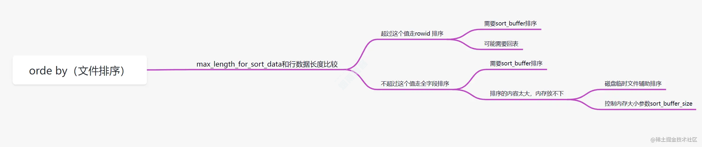 order by用到文件排序时,为什么查询效率会相对低呢?order by的文件排序,分为全字段排序和rowid排序。它是拿max_length_for_sort_data和结果行数据长度对比,如果结果行数据长度超过max_length_for_sort_data这个值,就会走rowid排序,相反,则走全字段排序。rowid排序
