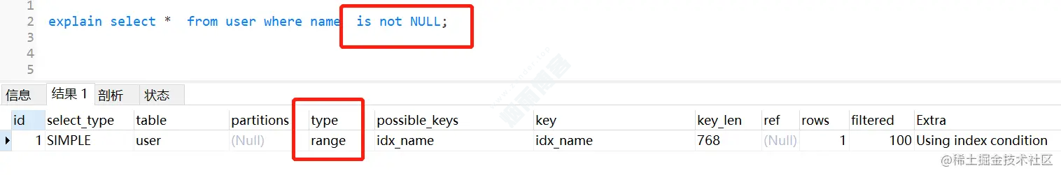 单个 name 字段加上索引,并查询 name 为非空的语句,其实会走索引的,如下: