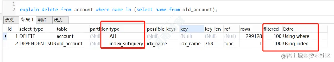 select + in子查询会走索引,delete + in子查询却不会走索引呢?explain select * from account where name in (select name from old_account); show WARNINGS; //可以查看优化后,最终执行的sql