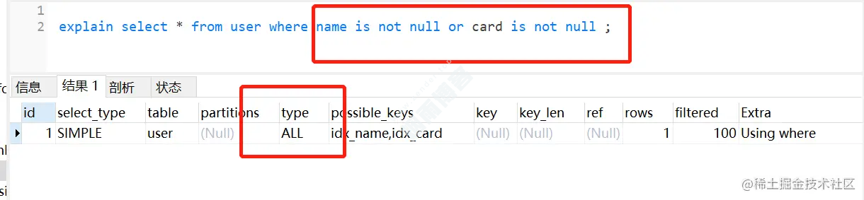 单个card字段加上索引,并查询name为非空的语句,其实会走索引的,如下: