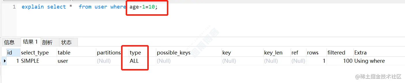 虽然age加了索引,但是因为它进行运算,索引直接迷路了。。。 如图:
