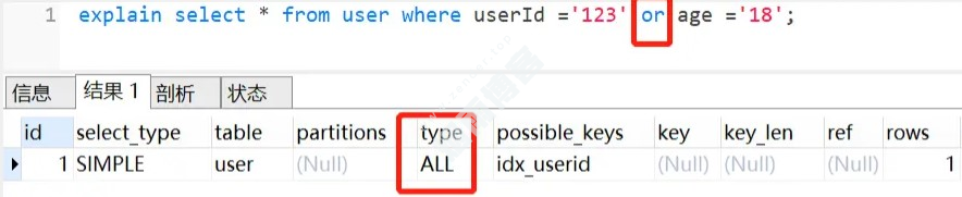 其中 userId 加了索引,但是 age 没有加索引的。我们使用了 or,以下SQL是不走索引的,如下:
