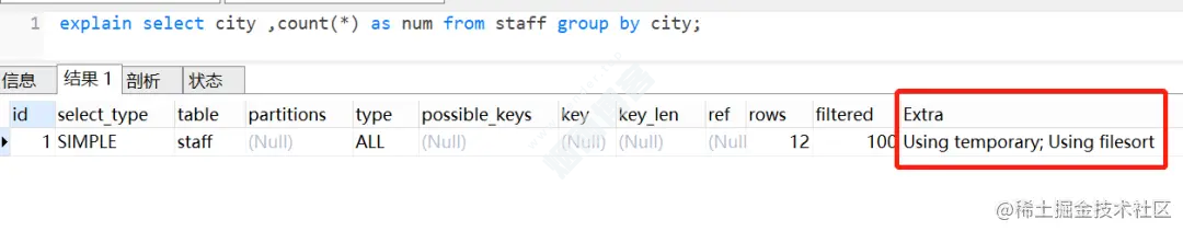 Using temporary表示在执行分组的时候使用了临时表xtra 这个字段的