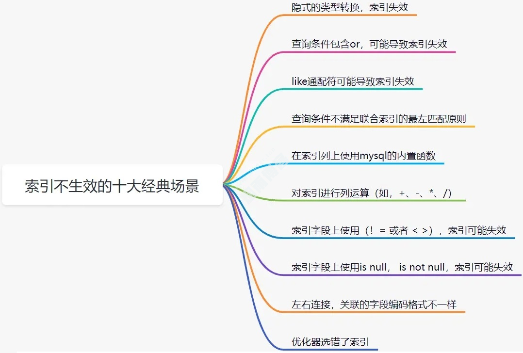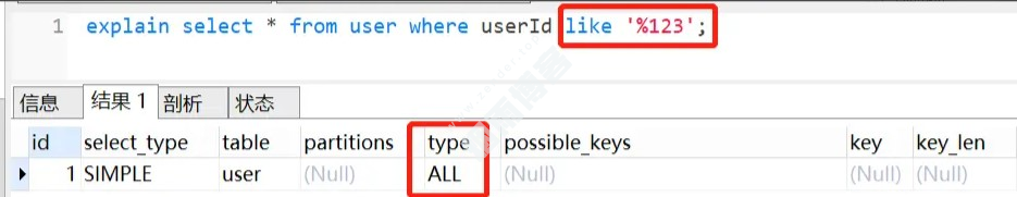 or 条件的列都加了索引,索引可能会走也可能不走(看数据量的大小,太少也有可能走全表扫描)。2.3. like通配符可能导致索引失效