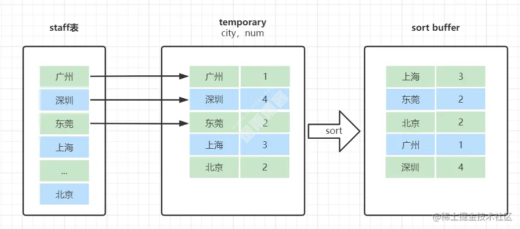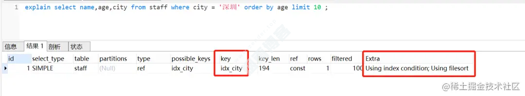 rowid排序,执行过程是这样:select name,age,city from staff where city = '深圳' order by age limit 10;
