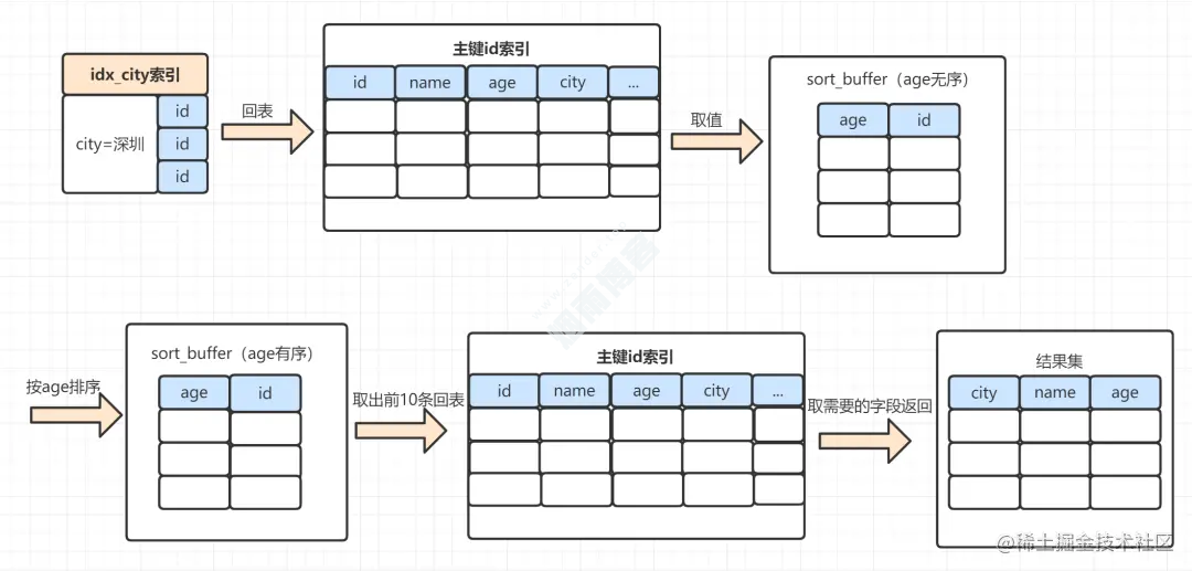 city为深圳的数据,在sort_buffer中,将所有数据根据age进行排序;遍历排序结果,取前10行,并按照