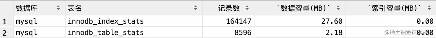 select table_schema as '数据库', table_name as '表名', table_rows as '记录数', truncate(data_length/1024/1024, 2) as '数据容量(MB)', truncate(index_length/1024/1024, 2) as '索引容量(MB)' from information_schema.tables where table_schema='mysql' order by data_length desc, index_length desc;