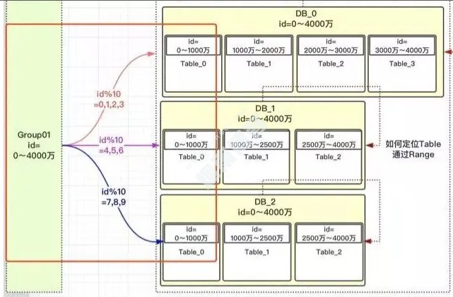 假如id为15000 然后对10取模(为啥对10 取模 因为有10个表),取0 然后 落在DB_0,然后在根据range 范围,落在Table_0 里面。