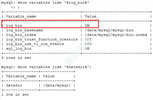 -- 查看binlog是否开启 show variables like '%log_bin%'; -- 查看binlog存放日志文件目录 show variables like '%datadir%';