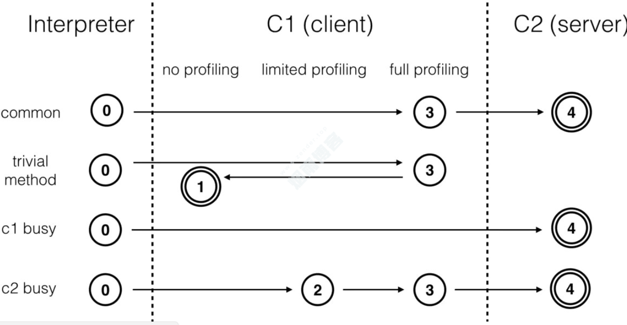 分层编译将 Java 虚拟机的执行状态分为了五个层次。为了方便阐述,我用“C1 代码”来指代由 C1 生成的机器码,“C2 代码”来指代由 C2 生成的机器码。五个层级分别是: